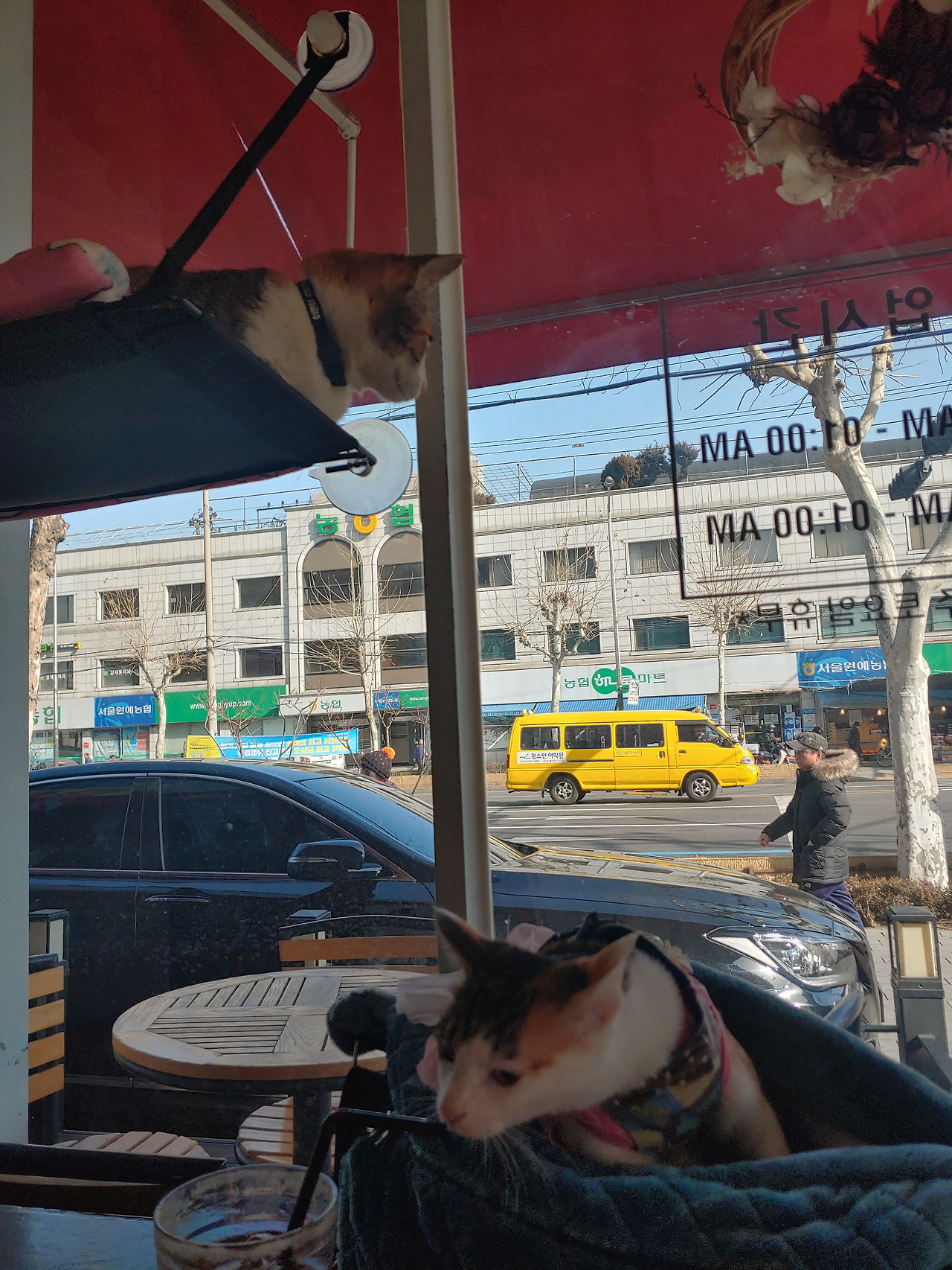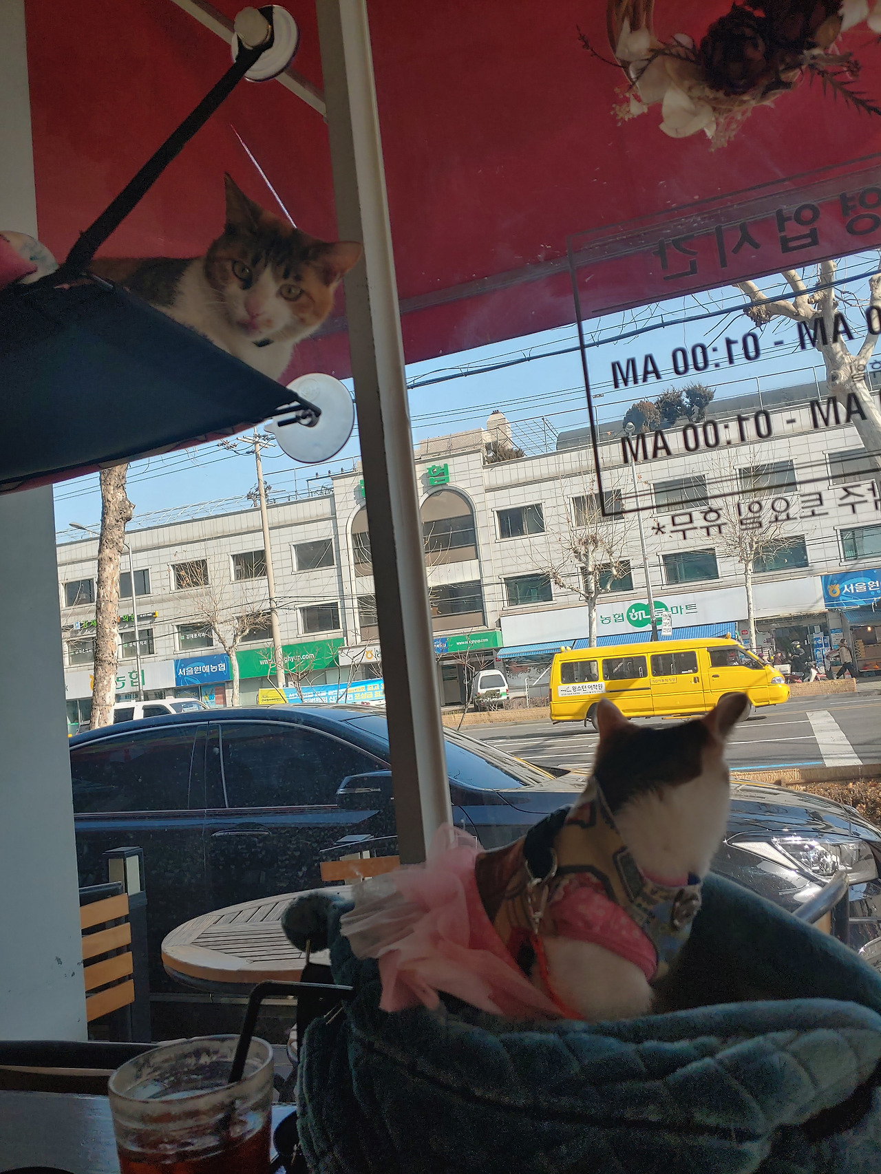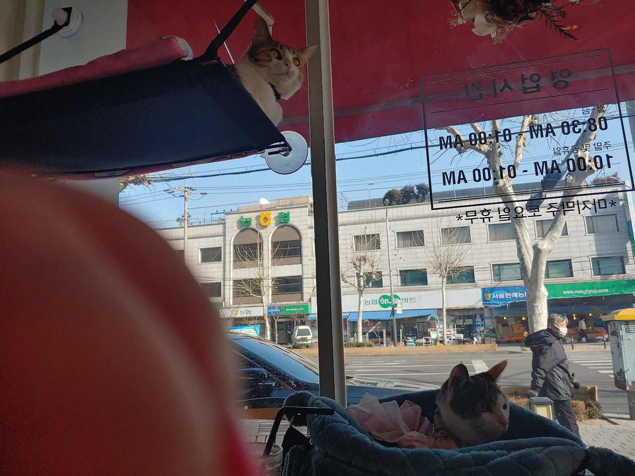 삼색 냥이 두 마리가 번갈아 유리창 해먹에 앉아 지나가는 차를 사람들을 비둘기를 바람을 구경하는 카페를 아시나요? 서로 비슷한 외모의 쪼금미 이와 행운이는 피 한 방울 섞이지 않았지만 산책 나온 행운 이에게 유리창 해먹을 양보하는 마음 착한 쪼끔미 입니다. 예전부터있던 카페에 아기를 잃은 쪼끔미가 들어오고 산책하러 행운이가 다녀가는 아메리카노가 연하고 고소한 카페입니다.