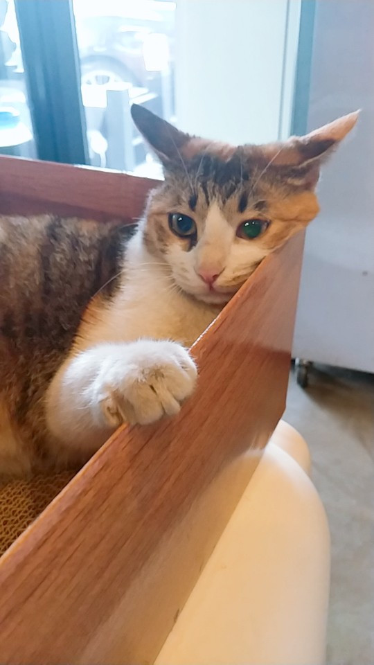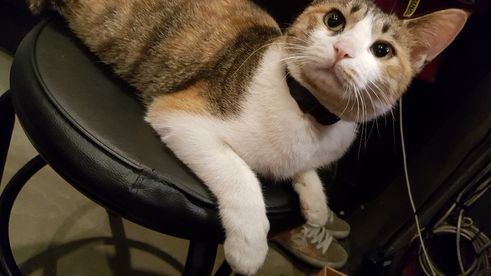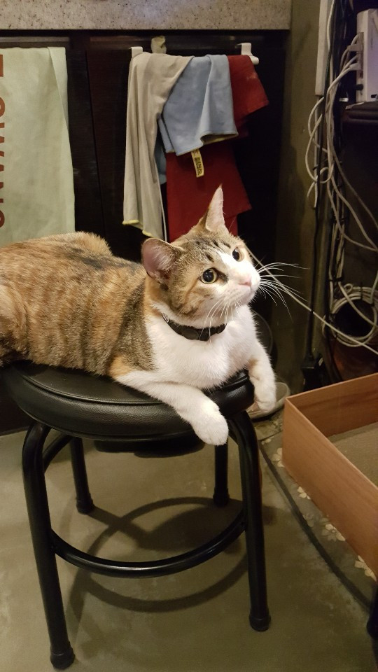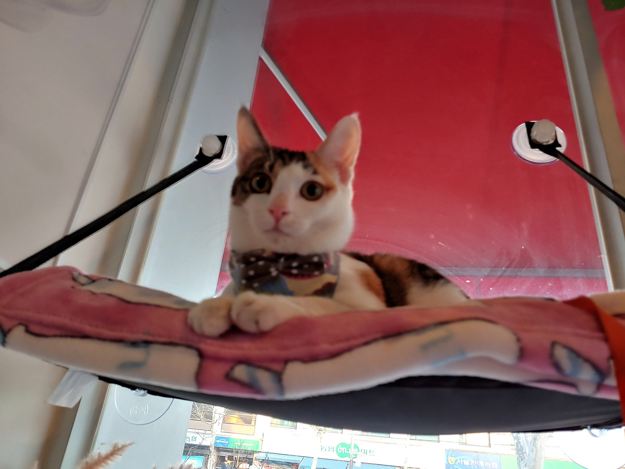 삼색 냥이 두 마리가 번갈아 유리창 해먹에 앉아 지나가는 차를 사람들을 비둘기를 바람을 구경하는 카페를 아시나요? 서로 비슷한 외모의 쪼금미 이와 행운이는 피 한 방울 섞이지 않았지만 산책 나온 행운 이에게 유리창 해먹을 양보하는 마음 착한 쪼끔미 입니다. 예전부터있던 카페에 아기를 잃은 쪼끔미가 들어오고 산책하러 행운이가 다녀가는 아메리카노가 연하고 고소한 카페입니다.