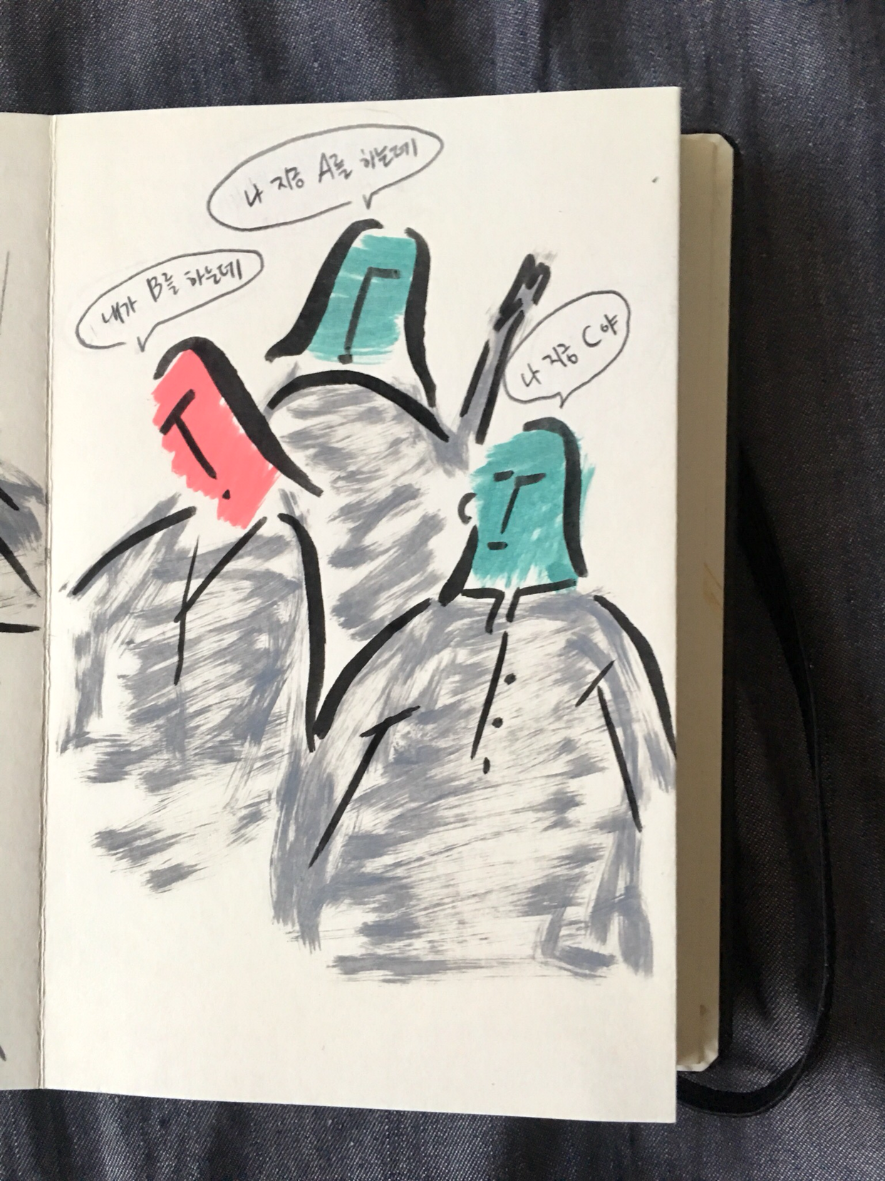 난 오늘날 어른들에게도 집단적 독백이 필요하다고 생각한다. 남을 배려하지 않고 날 위해 감정을 해소할 수 있는 공간. 여기선 새벽에 갑자기 우울했던 이야기, 과제에 치여서 자괴감에 빠진 이야기, 마음에 안드는 친구에 대한 험담, 나의 사회성에 대한 고찰 등 많은 이야기가 그냥 흘러간다. 그리고 모두 그냥 흘려듣는다. 암묵적으로 셋이서 동의했으니 가능한 일이다. 셋 다 딴 소리를 하고 있으니 누구하나 나무라지 않아도 된다. 그리고 어딘가 얘기했다는 생각에 후련해진다.