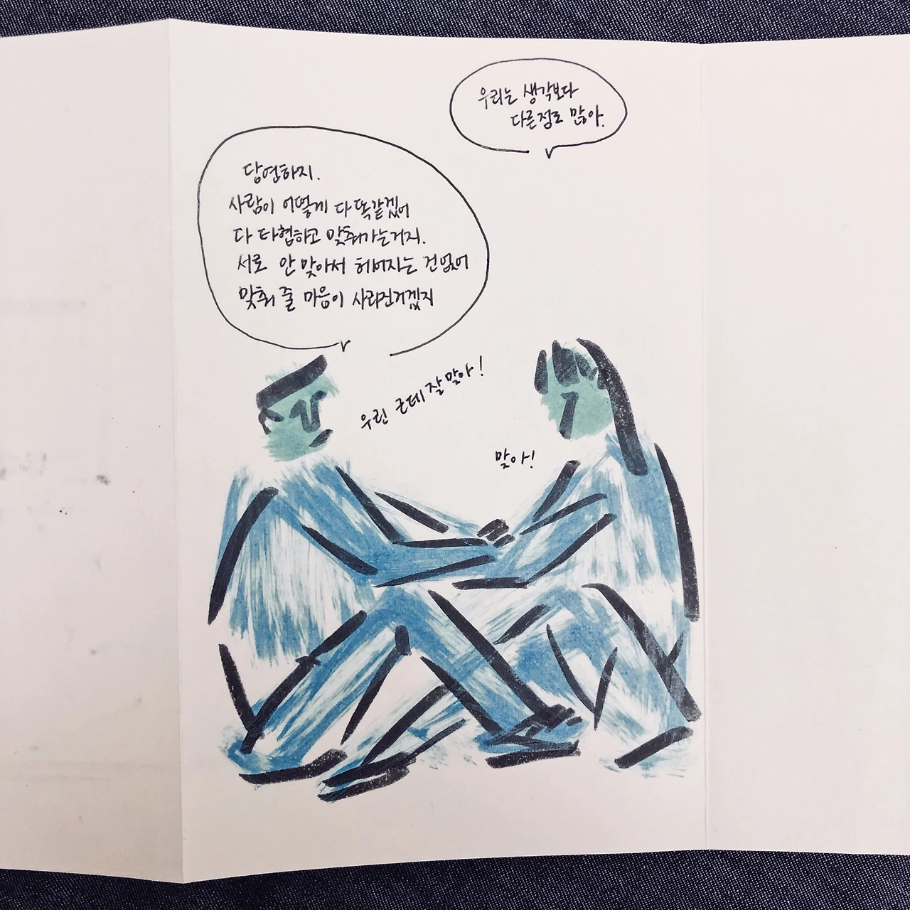 “사람은 다 안 맞아. 맞춰가는 거지. 서로 안 맞아서 헤어지는 건 없어. 맞춰 줄 마음이 없을 때 그 핑계로 헤어지는 거겠지” 그렇네. 네가 나에게 맞춰줘서 우리가 잘 맞다고 생각할지도 모를 일이다. 나도 같이 맞춰가야지.