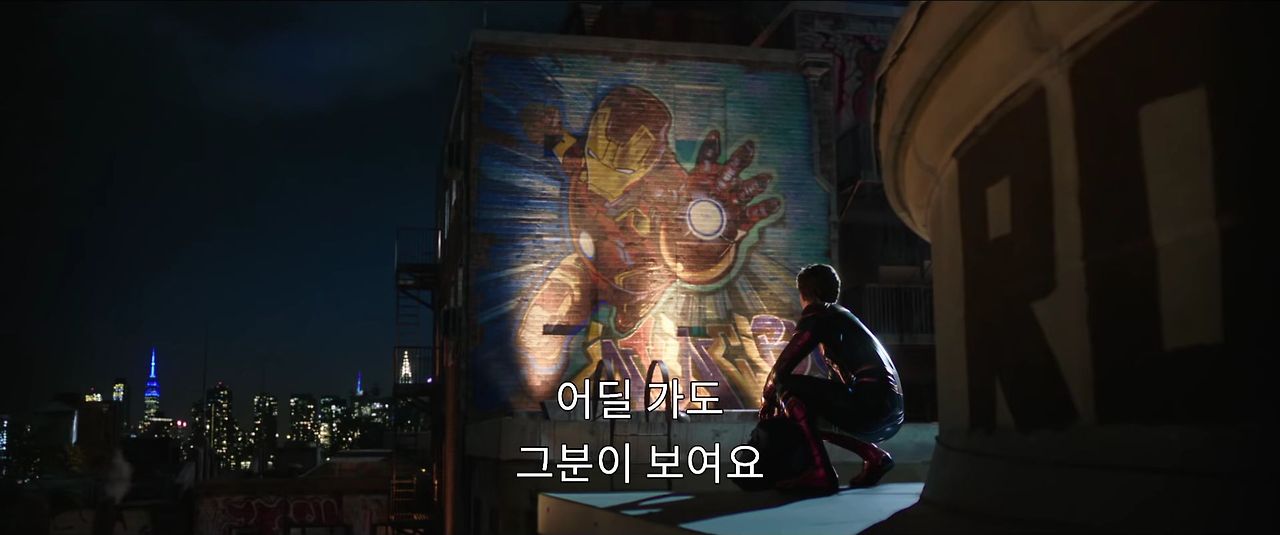 스파이더맨은 자신의 앞에 등장한 어마어마한 빌런이 '조작된 환상'이었음을 깨닫고 그곳을 향해 돌진한다. 그건, 자신을 짓눌렀던 어쩌면 또 하나의 조작된 환상일 수 있는, 신화가 된 아버지 아이언맨을 향한 돌진이요, 그저 어리숙한 착한 소년에 불과했던 자신의 지난날의 극복이다.