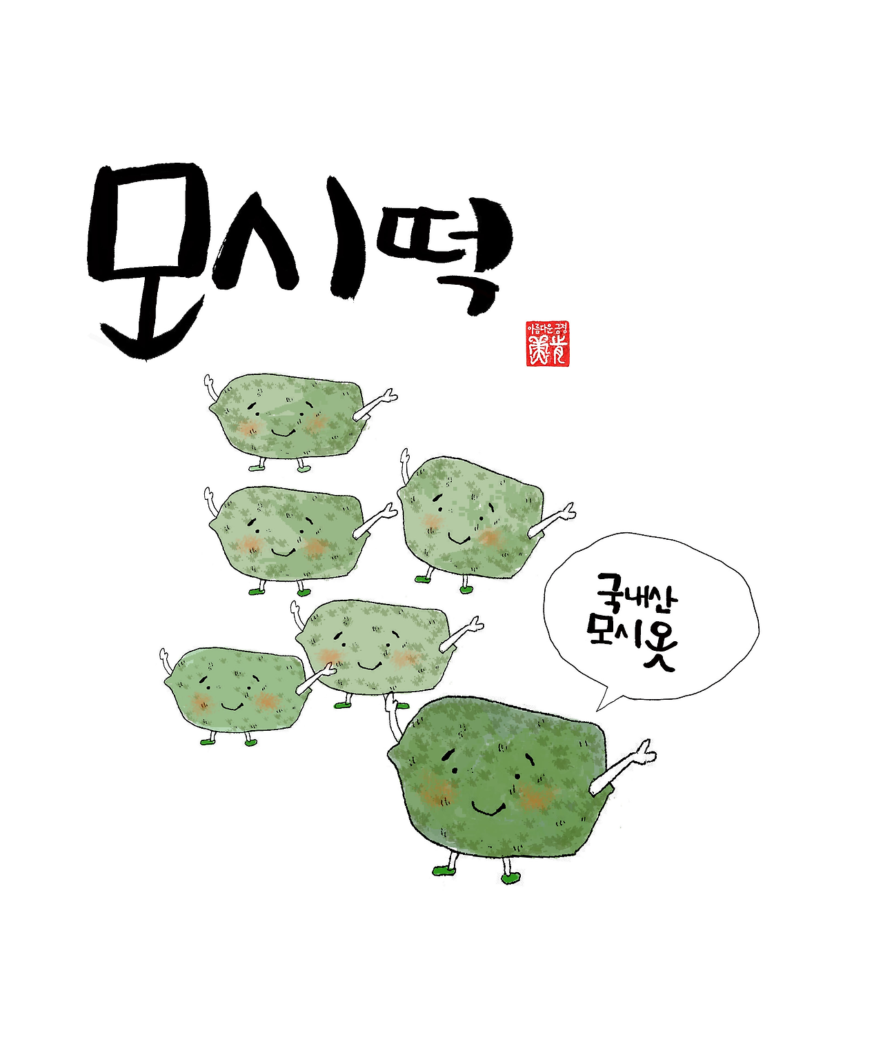 기울어지고 틀어져도 자연스러운 나의 그림처럼 꼭 반듯하지 않아도 정감 있는 글씨체 ‘미긍체’다. 떡 사장이 원하는 떡 캐릭터가 인절미, 모시떡, 송편, 떡볶이 떡 등을 글씨로 미리 연습해보았다. 그리고 캐릭터들마다 이야기를 담아 붓글씨와 함께 정적인 표정들을 살린다.