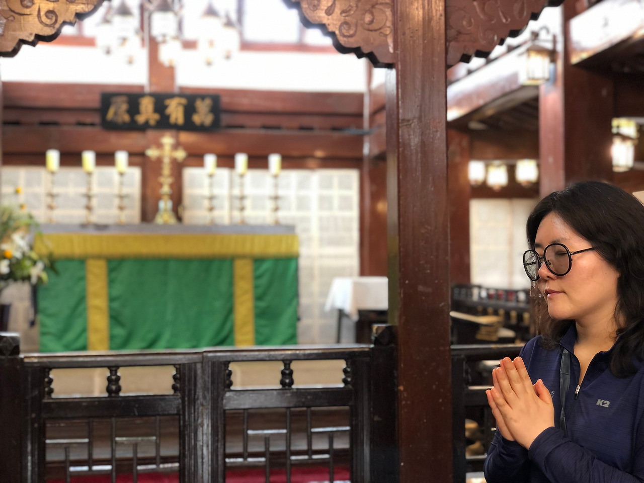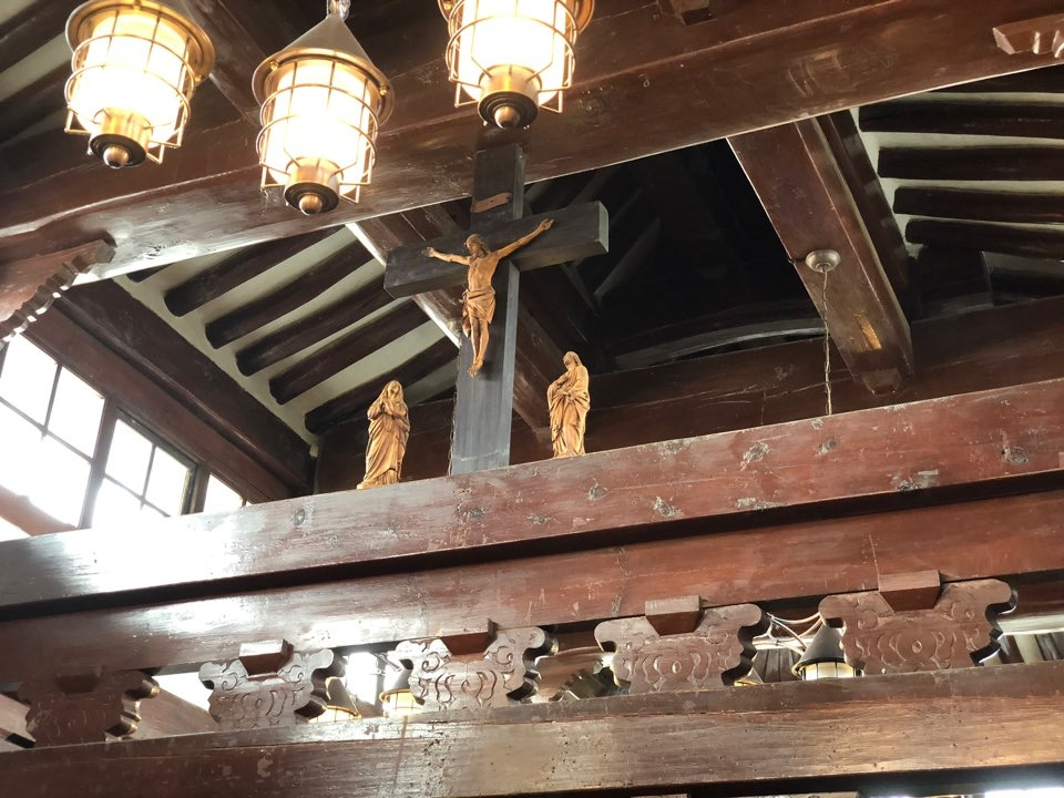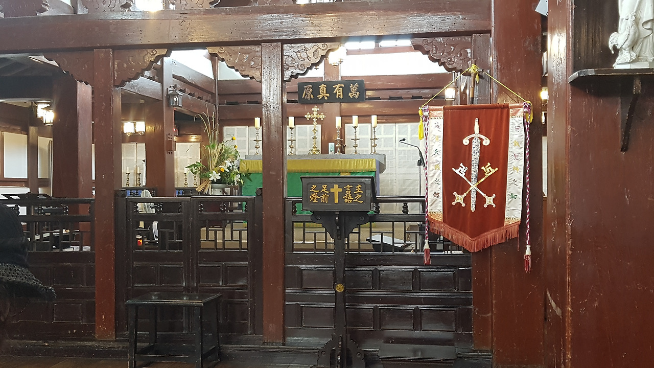 부처가 있어야 할 것 같은 한옥의 높은 천장에 예수상과 마리아상, 그리고 촛대들이 장식되어 있다.