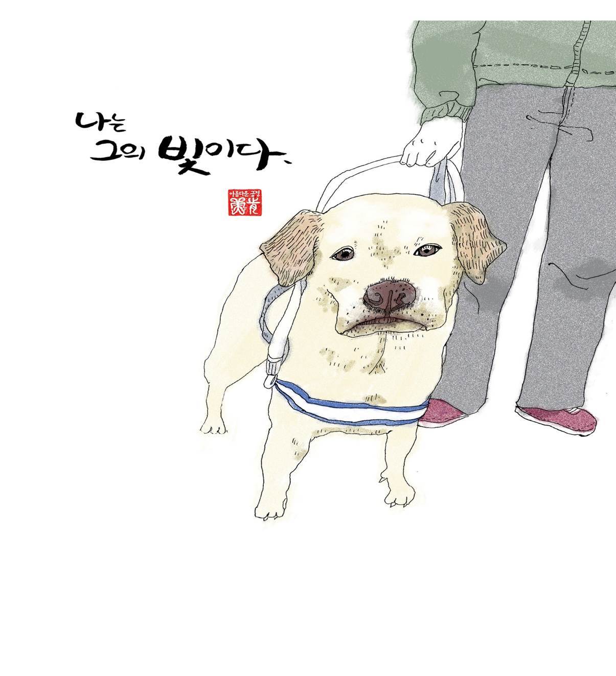 입을 크게 벌릴 수 있어서 물어뜯는 힘이 무척 세다고 해요. 이 그림에서 삵이 바라보고 있는 건 여러 겹으로 보이는 교통 표지판 ‘좌절 금지’ 저에게 생긴 시각장애를 삵이 보는 시선으로 의미했고요..”