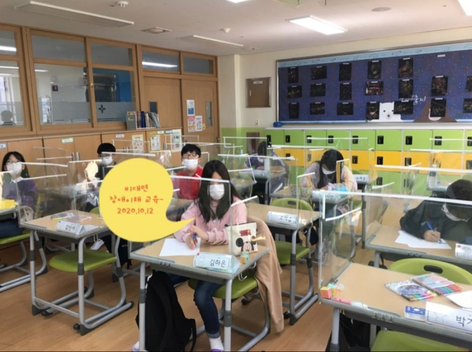 사진을 보니 아이들의 책상들마다 사방이 비닐로 차단되어 띄엄띄엄 떨어져있다.
