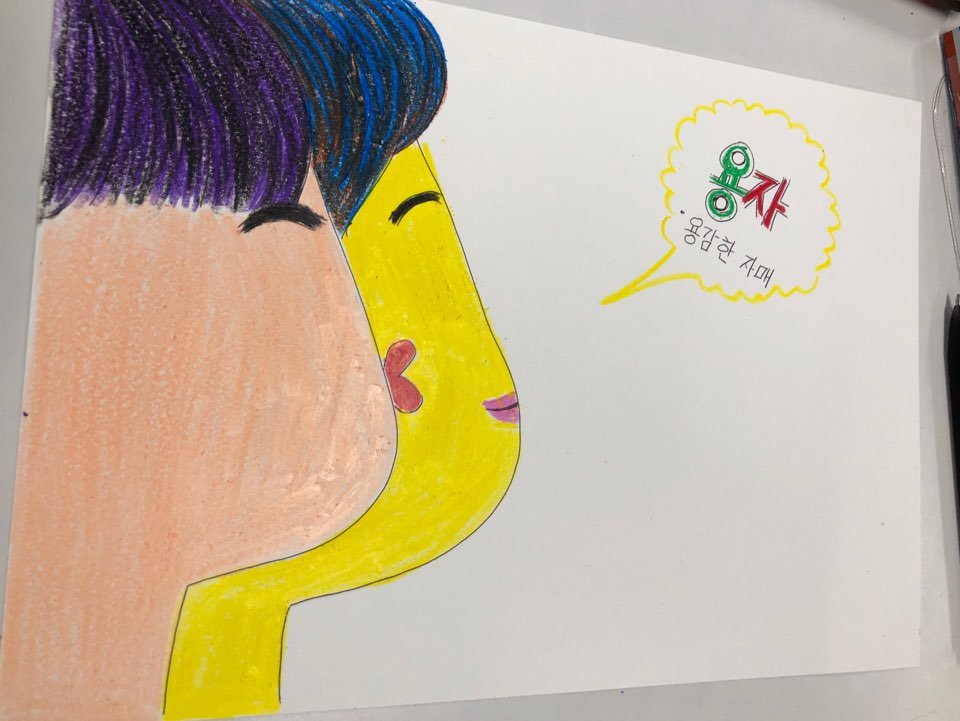 두 딸내미와 함께 수업에 참여한 엄마의 그림은 '용자‘다. ‘용감한 자매’의 줄임말이란다.(아.. 그래서 이번 수업에서 딸내미가 '용감하게' 그림으로 엄마를 꾸짖는 거구나..?!)