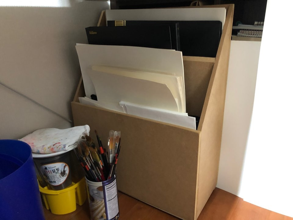 수업시간마다 그린 그림들을 모아놓은 스크랩북이 정리가 안 돼서 널브러진 책상을 보던 그가 며칠 후 스크랩북을 담을 수 있는