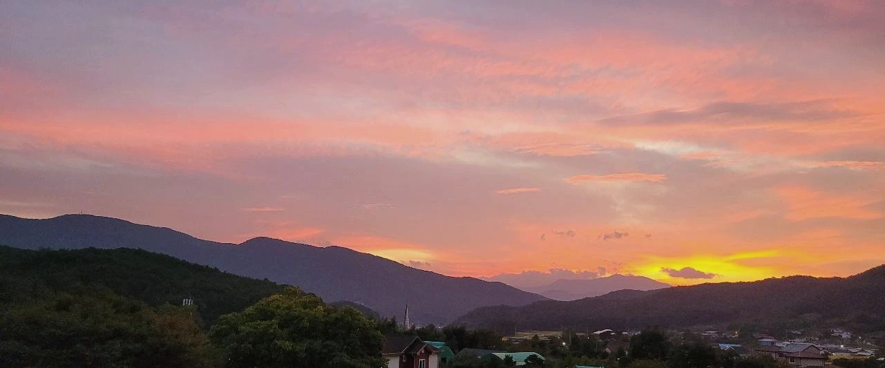 옥상 한가운데 서서 천천히 몸을 한 바퀴 돌려봅니다. 몽실몽실 혹은 뭉실뭉실한 산들이 에워싼 형상이 마치 연꽃 속에 앉아있는 듯한 느낌이 들어요. 이제 난간 턱에 기대어 앉아 보세요. 해 질 녘 서쪽으로 길게 물드는 노을을 따라 눈길을 보내면 고헌산과 가지산까지, 크고 작은 산들이 겹쳐 서 있는 능선이 마음을 아득하게 만들기도 한답니다.