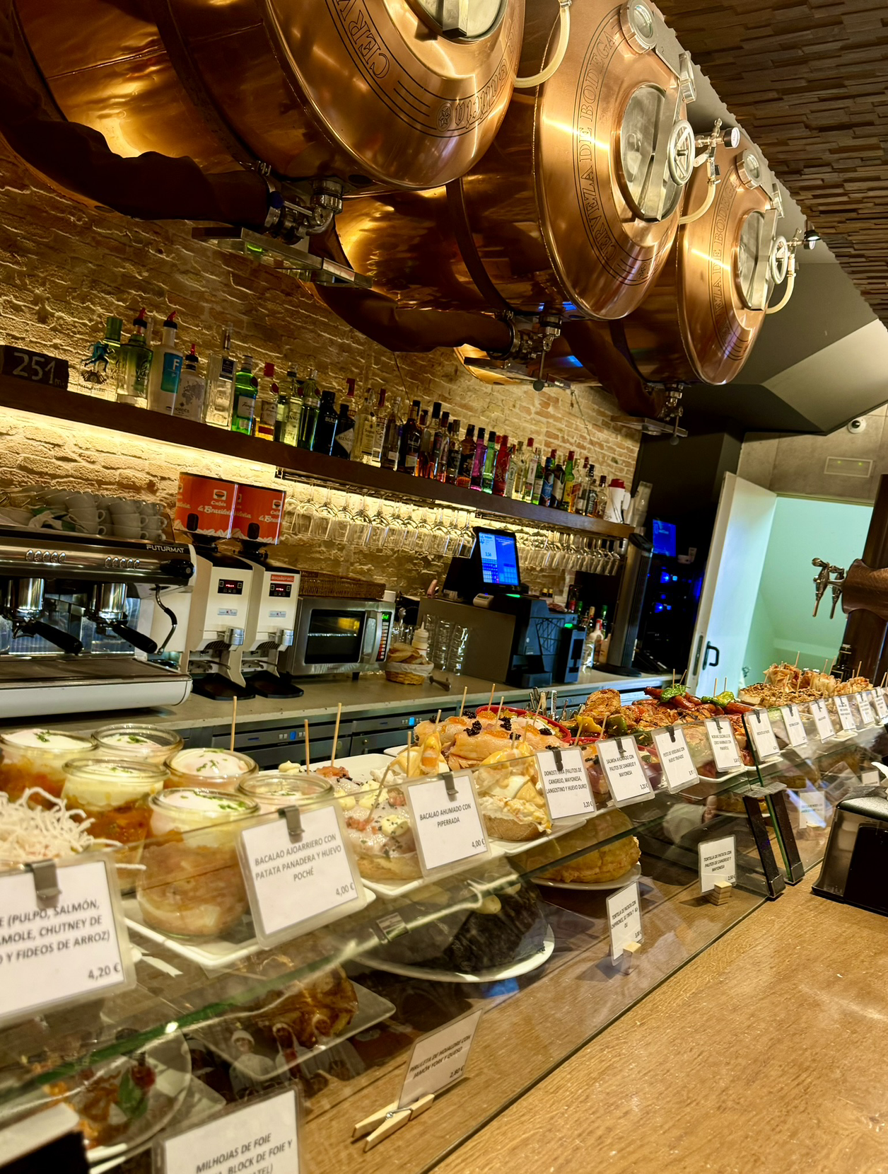 시골과 도시. 냉탕과 온탕을 오가는 이 여정은 새로움의 연속이다. 행색은 시골쥐 같은 모습이었기에 가볍게 옷을 갈아입고 나왔다. 뒤이어 이 도시를 살펴보기 전 스페인 음식인 핀초스&타파스를 먹어보며 기운을 내기로 한다. 회전초밥집에서 접시를 집어가는 느낌으로 바에 있는 점원에게 손으로 가리키며 '에스테, 에스테 포르 파보르(이거, 이거 주세요)' 하며 맛있어 보이는 것들을 주문한다. 눈에 보이는 그대로의 예상이 가는 맛이라 이질적이지 않고 입맛에 잘 맞았다. 개인적인 입맛으로는 프랑스에서 먹었던 음식보다 더 입맛에 맞았다. 게다가 생맥주랑 곁들이니 더할 나위 없이 좋다. 예닐곱접시를 비우고 나와 광장으로 가서 가만히 벤치에 앉아 이 도시를 찬찬히 둘러본다. 잔잔한 음악이 흘러나와 둘러보니 이 광장의 배경음악의 출처는 구석에서 기타 연주를 하는 버스커의 솜씨였다.