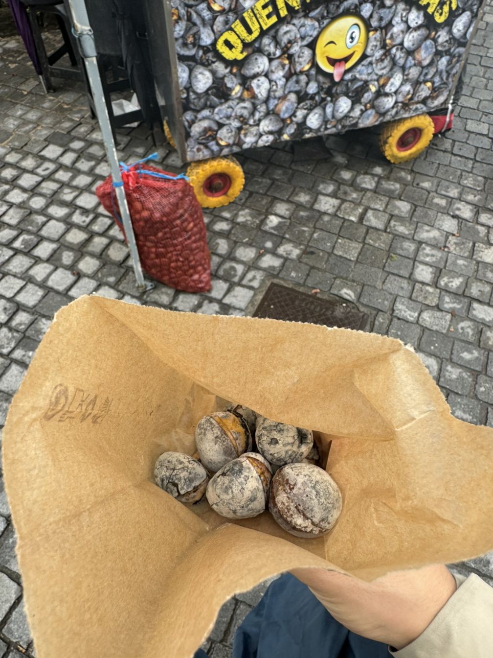 즐거워진 눈은 세상을 더 아름답게 보이게 한다. 뒤이어 다음 행선지인 루이스 다리를 향하던 중 길을 걷다 보니 고소하고 달콤한 냄새가 난다. 군밤이다. 멀리서부터 보이는 연기와 함께 고소한 냄새가 풍겨온다. 큰 골목마다 군밤을 팔고 있기에 한 봉지 샀다.
