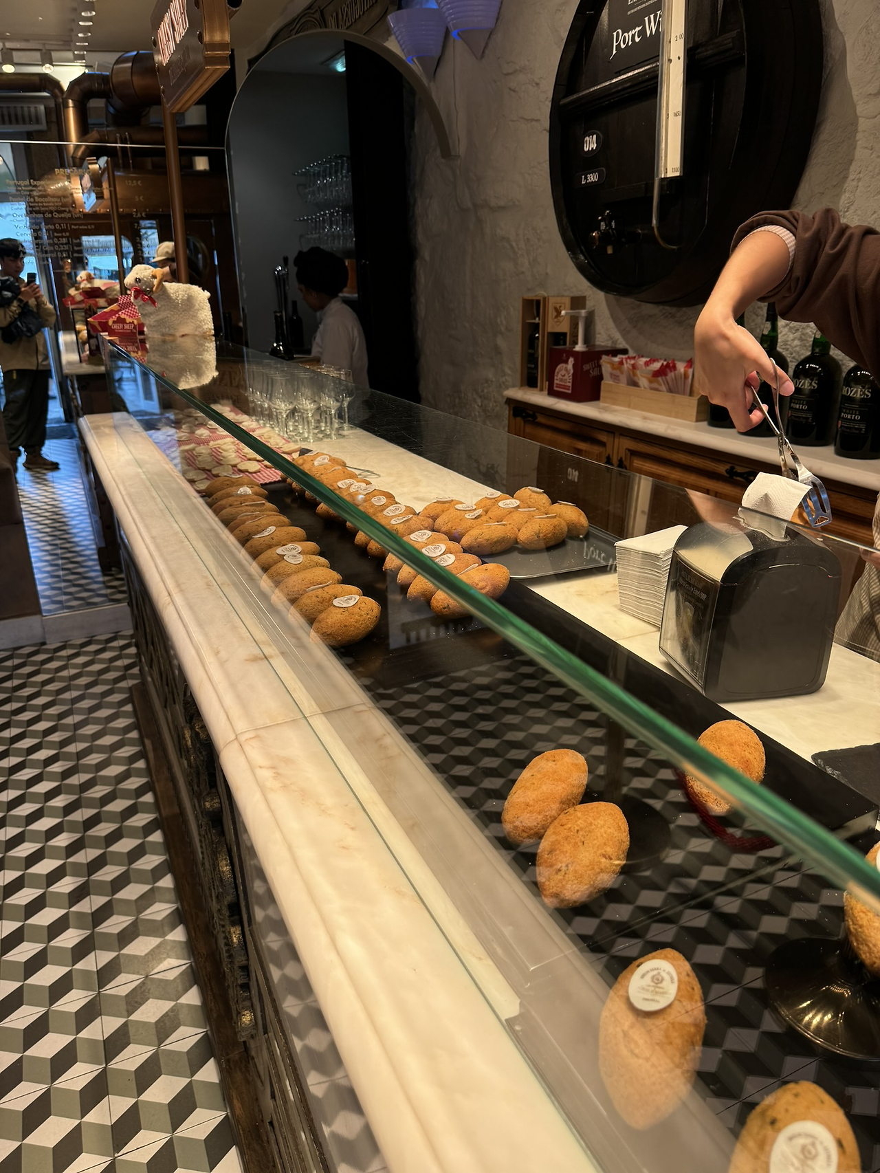 단일메뉴의 식사를 마치고 조금 쌀쌀한 날씨와 어울리는 디저트를 찾아 돌아다니던 중 눈에 띄는 예쁜 가게를 발견했다. 안에 들어가서 보니 동그란 구형 모양의 빵과 음료를 팔았으며 빵은 대구로 만든 크로켓 느낌의 빵인데 생긴 건 공룡알 빵처럼 생겼다. 빵 안에 말린 대구살과 치즈를 넣어 만들었다는데 가게 인테리어가 이뻐서인지 홀린 듯 들어가서 주문을 했다.