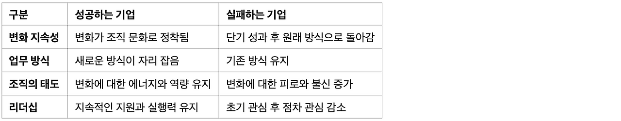 ➥ 즉, 변화를 일시적인 프로젝트가 아니라 '조직 문화로 내재화'하여 지속 가능한 성장을 유지한다.