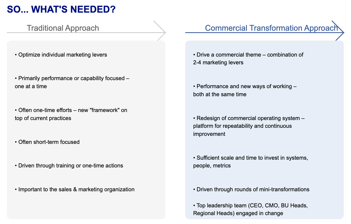 전통적인 접근 방식(Traditional Approach)과 상업적 변혁 접근 방식(Commercial Transformation Approach)의 차이를 정리해 본다. 기업이 지속적인 성과를 내기 위해서는 전통적인 접근 방식에서 벗어나 변혁적 접근 방식을 도입해야 함을 강조하고자 한다.