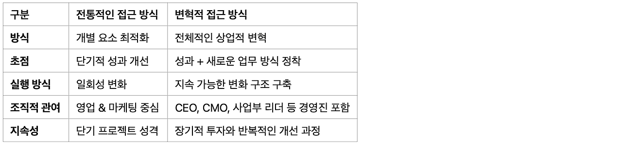 ➥ 핵심 차이점: 전통적 접근 방식은 개별적인 성과 개선에 초점을 맞추는 반면, 변혁적 접근 방식은 조직 전체의 변화를 통해 지속 가능한 성과를 창출한다.