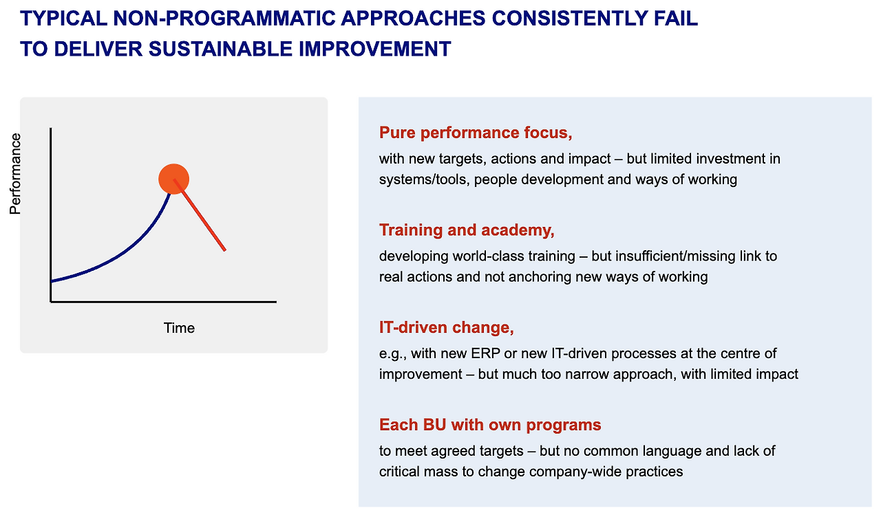 - 부분적인 접근 방식(성과 중심, 교육, IT 도입, 사업부별 프로그램)만으로는 지속적인 성과 개선이 어렵다.