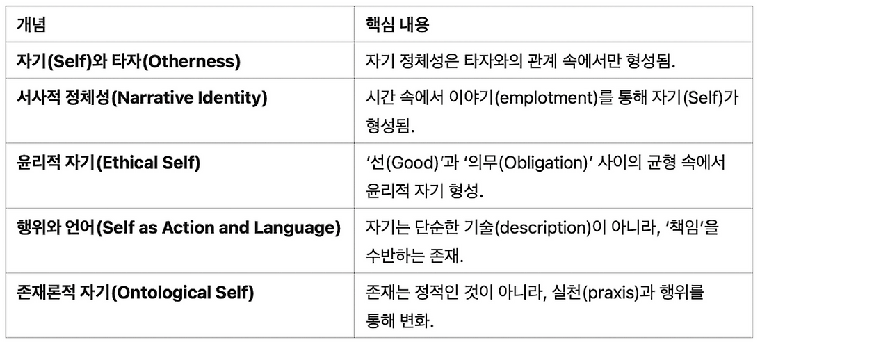 - Oneself as Another (1992): 자아 개념과 철학적 전통을 연결 (Descartes, Hume, Searle 등과 비교).