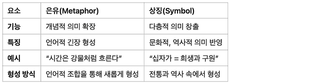 - 메타포와 상징은 모두 다중 의미와 긴장을 내포함.