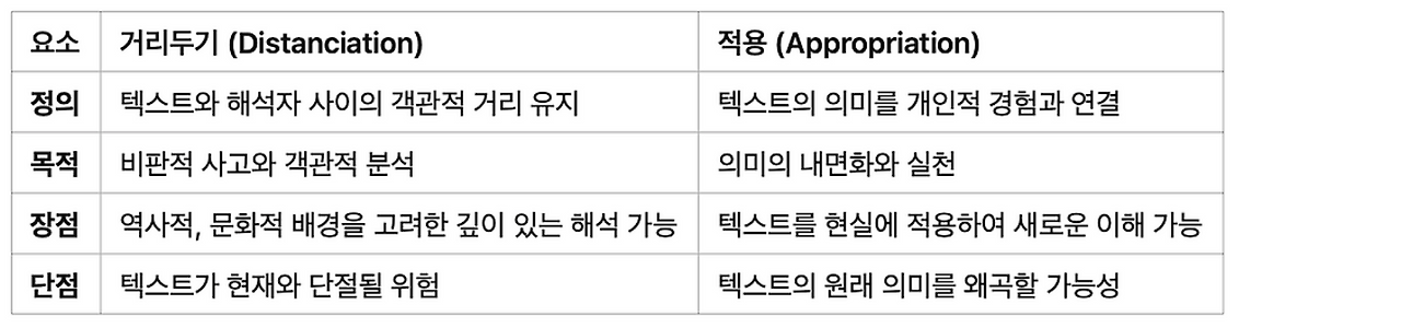 - ‘거리두기’는 텍스트를 객관적으로 분석할 수 있게 해주고, ‘적용’은 해석자가 그 의미를 삶 속에서 경험할 수 있도록 한다.