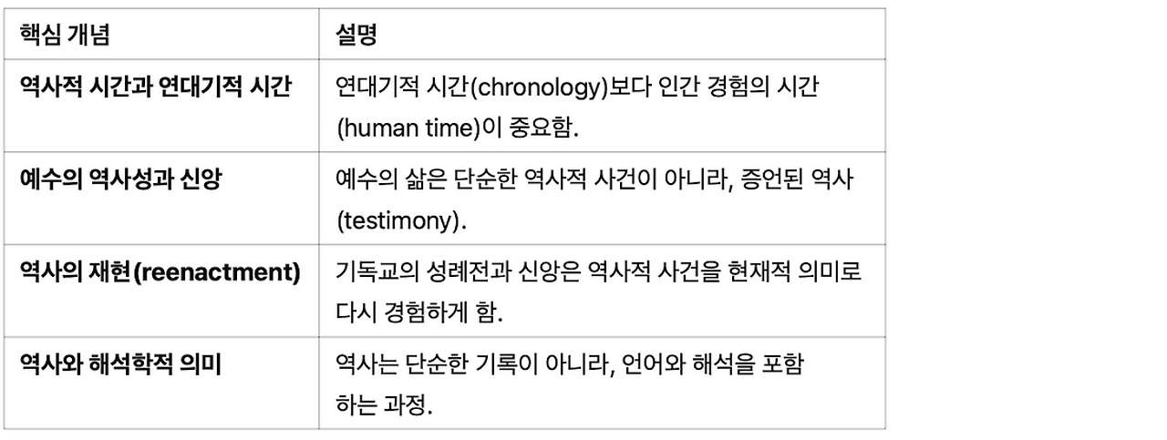 3. 역사적 사건(예: 예수의 삶)은 신앙적 해석을 통해 현재적 의미를 갖는다.