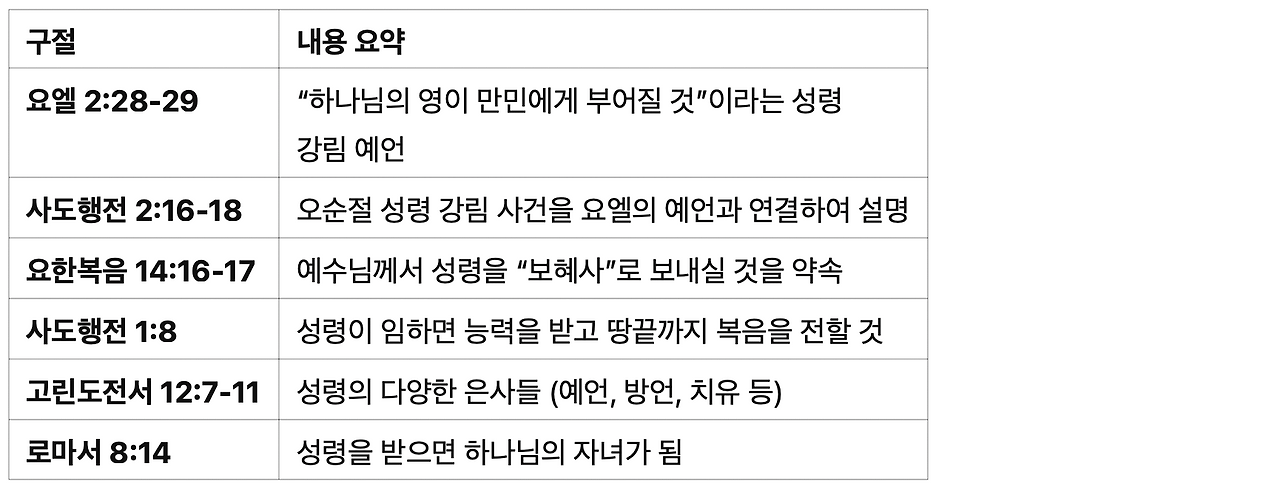 - “성령의 은사” (예언, 방언, 치유, 지혜 등)도 요엘서의 예언과 연결.