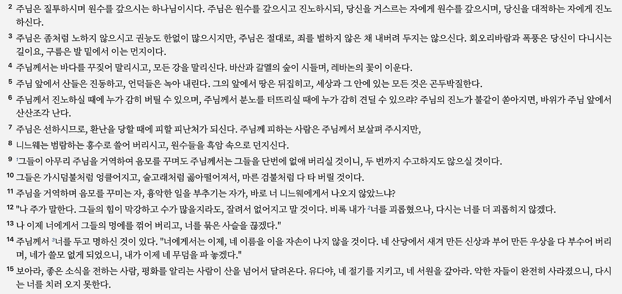 - 1:2-8에서는 하나님이 자연과 세계를 지배하며, 심판을 집행하는 장면이 묘사된다.