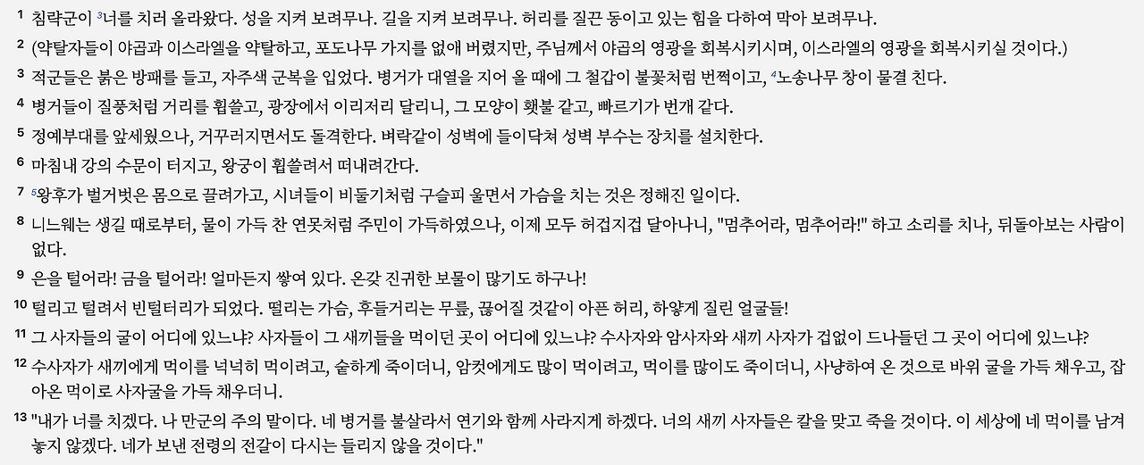- 전체적인 문맥에서 하나님의 절대적인 힘, 유다에 대한 보호, 그리고 악한 도성(니느웨)의 필연적인 몰락이 주된 메시지로 나타난다.