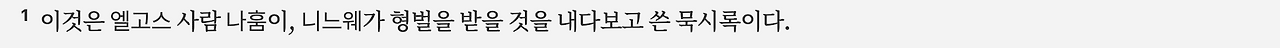 - 3:19에서는 지나치게 잔인했던 니느웨가, 그에 상응하는 잔혹한 최후를 맞이할 것임을 선언한다.