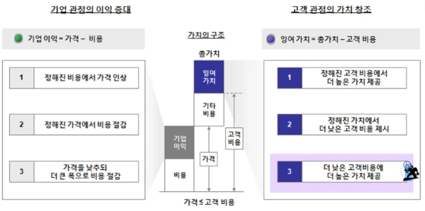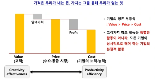 즉 고객에게는 ‘잉여’가 있어야 하겠고, 기업에게는 ‘이익(profit)’이 가치가 될 것입니다. 이러한 것을 만들어가는. 과정을 경영 활동이라고 할 수 있겠습니다.