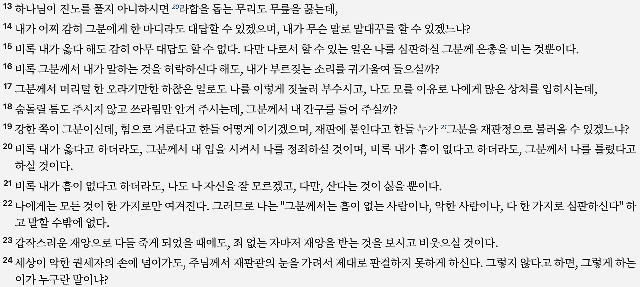 9:13–24: 욥은 하나님을 재판관에 비유하면서, 인간이 하나님 앞에 설 수 없는 법적 불공평성을 강조합니다.