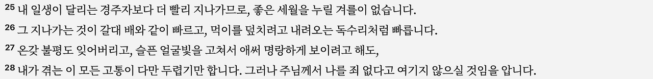 9:25–28: 욥은 자기 생애의 무상함을 탄식하며, 날들은 조각배처럼, 독수리처럼 빠르게 지나간다고 표현합니다.
