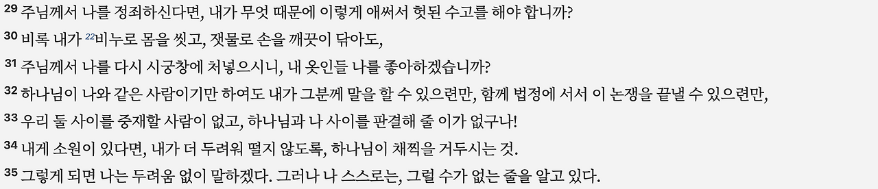 9:29–35: 욥은 하나님 앞에 대등한 관계에서 변론할 수 있는 중재자가 없음을 한탄합니다.