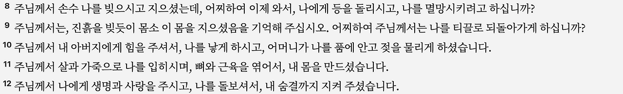 10:8–12: 욥은 하나님이 세심하게 자신을 창조하신 사실을 상기시킵니다.
