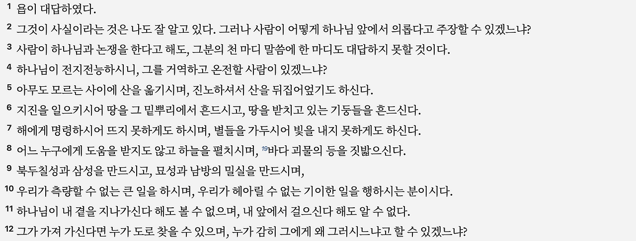 9:1–12: 욥은 하나님의 절대적 지혜와 권능을 인정하면서도, 그것이 인간을 위한 것이 아니라고 느낍니다.