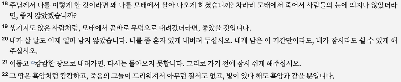 10:18–22: 욥은 다시 죽음의 안식을 갈망합니다.