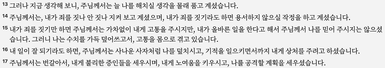 - 고통을 잊으려 해도, 하나님께서 자신을 끊임없이 괴롭히신다는 절망을 토로합니다.