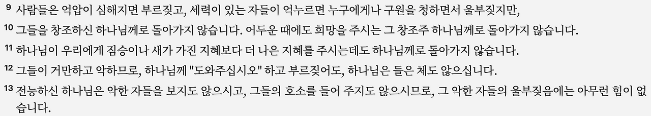 사람들은 억울할 때 하나님께 부르짖지만, 진심 어린 회개 없이 그저 구출만 바라기 때문에 하나님이 응답하지 않으신다는 것입니다(35:9–13).