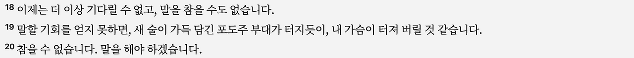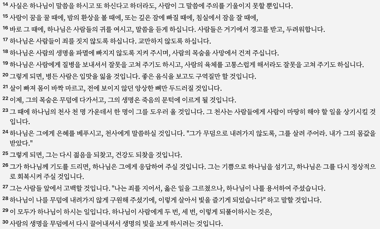 아울러 엘리후는 욥의 절망 가운데서도 하나님은 여러 방식으로 말씀하신다고 전합니다. 지금의 신앙인인 우리들에게 이는 고통이나 혼란 중에도 하나님이 여전히 활동하고 계심을 기억하게 하며, 영적 둔감함에서 벗어나 깨어 있는 삶을 추구하게 합니다.