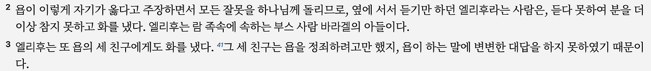 - 욥이 자신을 의롭다고 주장하며 하나님보다 의롭다고 한 것에 분노 (32:2)