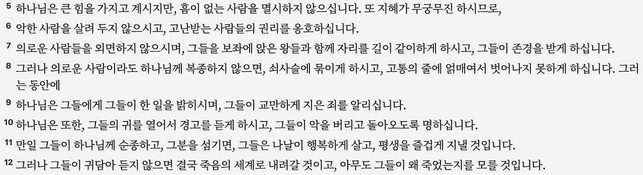 엘리후는 하나님을 찬양하며, 하나님은 권능과 공의를 겸비한 분이라 진술합니다(36:5–12).