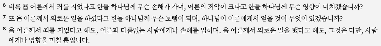 인간의 죄나 의는 하나님께 아무 영향도 주지 않으며, 다른 인간에게 영향을 미친다고 얘기합니다(35:6–8).