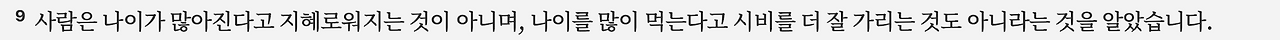 엘리후는 지혜가 나이와 권위보다 성령이 주시는 통찰이라고 발언합니다. 이는 교회나 신앙 공동체 안에서 나이, 연륜, 지위보다 하나님의 영의 인도하심에 순종하는 것이 우선됨을 교훈합니다.
