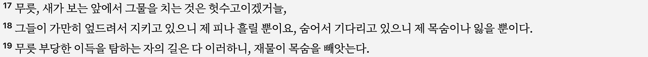 잠언 1:8–19은 지혜를 향한 첫걸음을 내딛는 청년에게 주는 강력한 경고입니다. 악한 동료들과의 연대는 공동체적, 개인적 파멸을 부른다는 사실을 반복 강조하며, 지혜는 궁극적으로 생명을 보존하는 길이라는 점을 분명히 합니다. 이는 곧 지혜문학이 추구하는 윤리적 질서와 실천적 정의의 핵심이 되겠습니다.