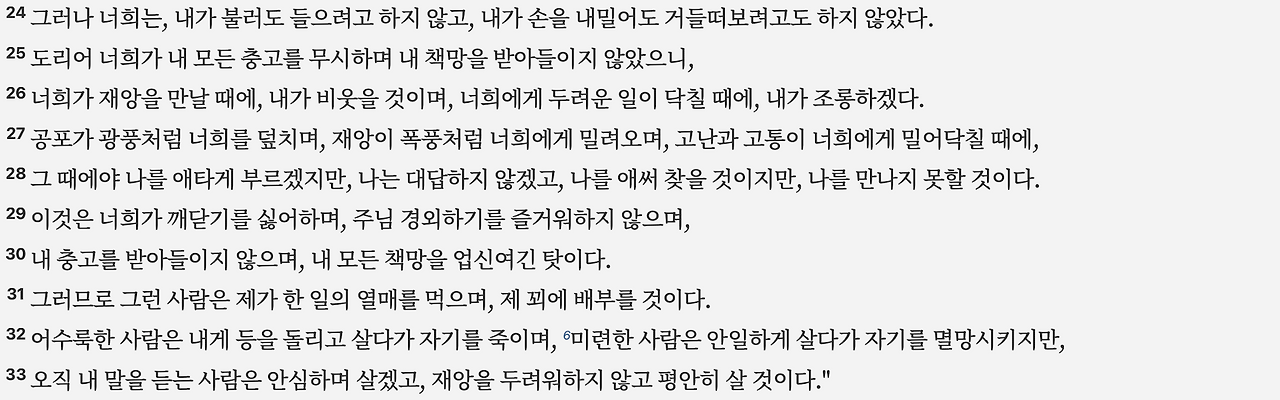 - 재난과 파멸: 지혜의 부름에 응답하지 않으면 반드시 재앙을 맞이하게 됩니다.