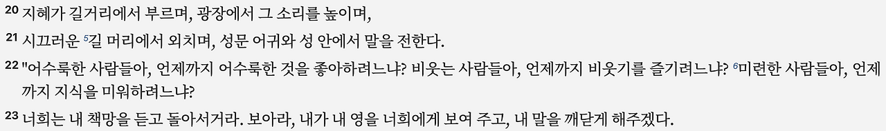 지혜는 길거리와 광장에서 사람들을 향해 외치는 여성으로 의인화됩니다(1:20).