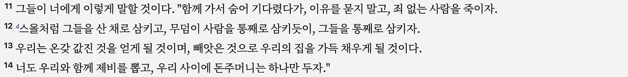 - 폭력과 강도질: “가만히 엎드려 사람의 피를 흘리자.”