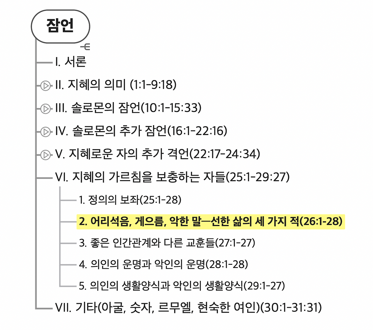 26장은 어리석음, 게으름, 악한 말이라는 세 가지 주제를 중심으로 구성된 금언 모음입니다. 이 장은 편집자의 의도가 뚜렷하게 반영된 구조를 갖추고 있으며, 각 단락은 주제별로 정돈되어 있습니다. 야웨라는 신명은 직접 언급되지 않지만, 전체적으로 신적 질서가 인간의 행동을 지배한다는 전제를 암시하고 있습니다.