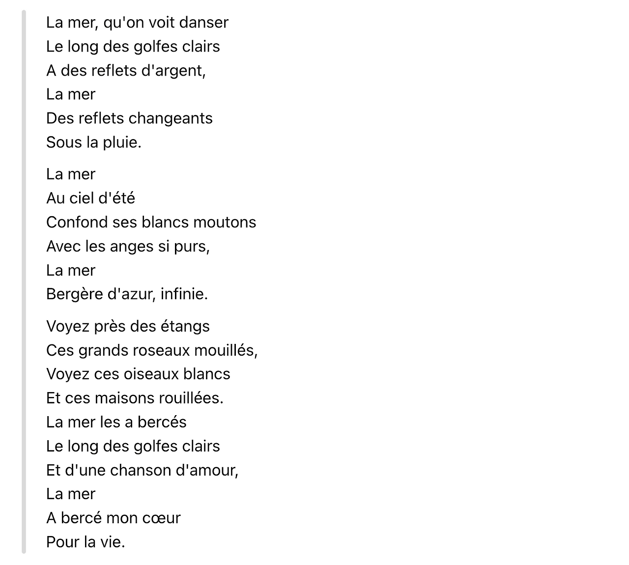 〈La Mer〉(바다)는 그가 16세 무렵에 쓴 시를 바탕으로 훗날 곡으로 작곡한 작품입니다. 이후 이 곡은 영미권에서 "Beyond the Sea"라는 제목으로 번안되어 널리 알려졌고, 아마 그런 이유로 저에게까지 닿게 된 것일 겁니다.