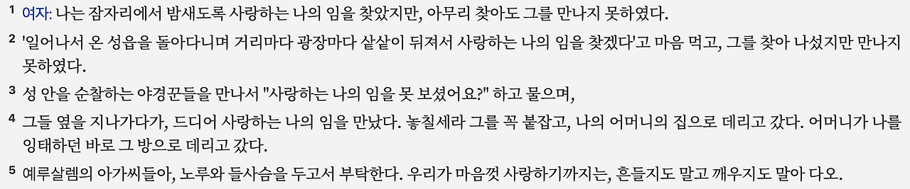 그 탐색이 실제였는지 아니면 상상인지에 대해서는 명확한 결론을 내리기 어렵습니다. 다만 여인이 사랑하는 이를 발견하고 자신의 공간으로 인도했다는 점은 중요하게 보아야 하겠습니다. 이러한 장면은 실제보다는 상상 속 사건일 가능성이 크며, 여인의 정서적 고조를 나타냅니다. 마지막 5절의 "예루살렘의 딸들"을 향한 간청은 다소 맥락과 맞지 않아 보일 수도 있으나, 사랑에 수반되는 기쁨과 동시에 아픔이 있다는 점을 암시하는 표현으로 해석될 수 있습니다.
