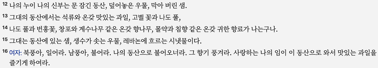 이 시는 여인을 ‘닫힌 동산’과 ‘봉인된 샘’이라는 표현으로 상징합니다. 이는 여인의 순결성과 접근의 어려움을 상징하는 동시에 그녀의 아름다움과 풍요로움을 시적으로 표현한 것입니다. 4:16에서는 여인이 스스로 북풍과 남풍에게 동산의 향기를 퍼뜨려 사랑하는 이를 불러들이도록 청하고 있으며, 이는 모든 제약이 해소되고 사랑이 이루어지기를 바라는 열망의 표현이라 할 수 있습니다.