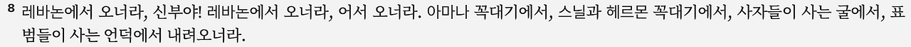 이 구절은 아가서에서 "신부"라는 단어가 처음 등장하는 부분이며, 이후 몇 차례 반복적으로 나타납니다. 여인이 들짐승이 출몰하는 험지에서 무엇을 하고 있었는지에 대해서는 확실치 않으며, 학자들 중 일부는 이것을 여인의 접근 불가능성을 상징하는 시적 장치로 이해하고 있습니다. 그러나 6절에서 나타난 남자의 접근을 암시하는 표현과는 모순될 수도 있어, 조화로운 해석이 필요합니다.
